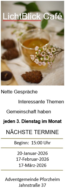 Wir freuen uns, jeden Samstag gemeinsam Gottesdienst zu feiern: Bibelgespräch um 10:00 Uhr Predigt um 11:00 Uhr Adresse Jahnstr. 3775173 Pforzheim